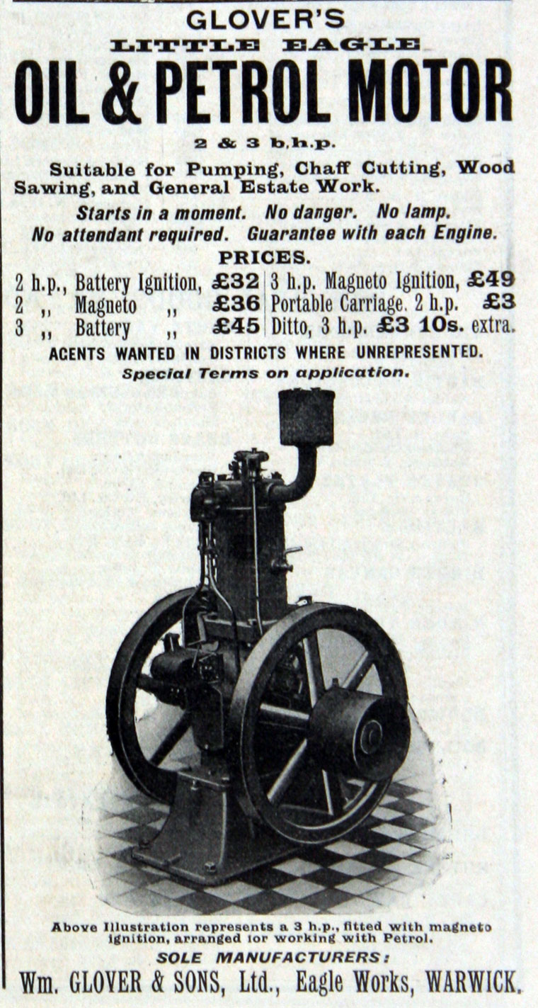 The Glover family in Warwick has a notable history in engineering and manufacturing.  William Glover & Sons was founded by James William Glover, a prominent agricultural engineer and manufacturer in Warwick. The company eventually became The Eagle Manufacturing Company and later Dennis Eagle, which still operates today. Another branch of the family had a carriage making business in Warwick & Leamington.